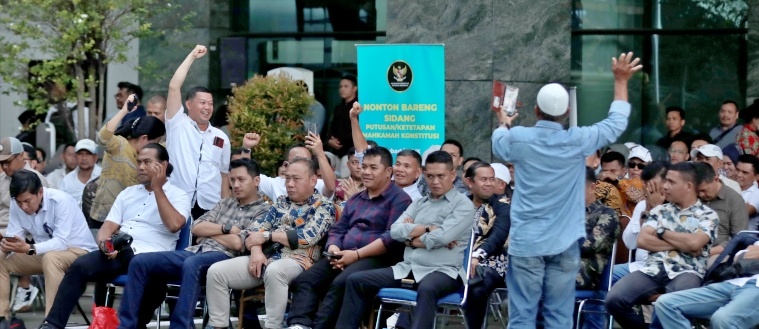 Ekpresi pendukung para pihak ketika menonton bersama Sidang Pengucapan Putusan sedi kedua pada Senin (24/02) di Halaman Gedung 2 Mahkamah Konstitusi (MK). Foto Humas