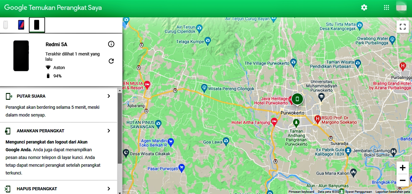 - Pada layar akan muncul peta dengan perkiraan titik lokasi ponsel. Lokasi yang ditunjukkan merupakan perkiraan. Selain itu, ditampilkan juga tipe hp, lengkap dengan waktu terakhir hp diaktifkan dan persentase sisa baterai.