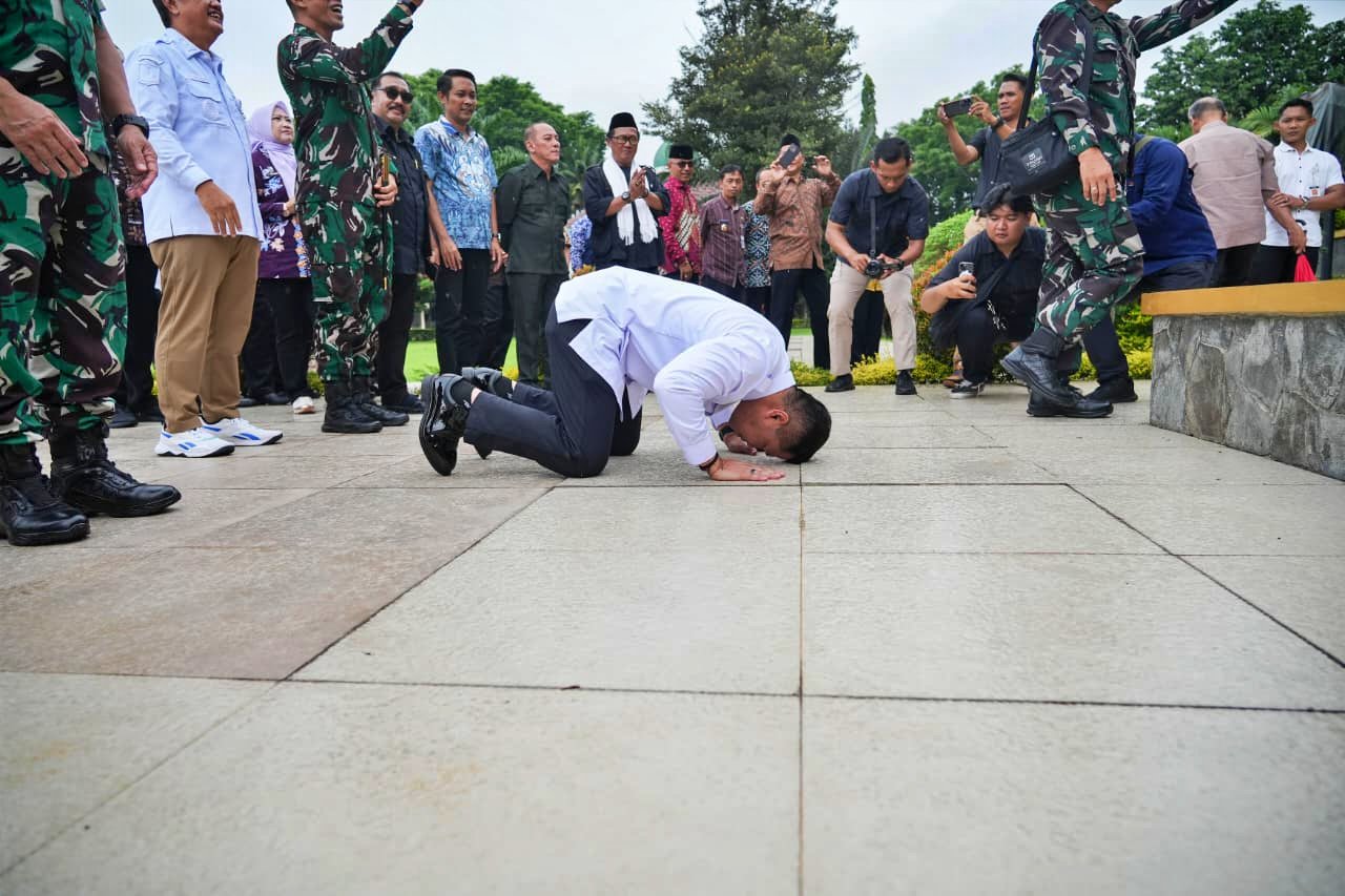 BNEWS—MAGELANG— Sebuah momen mengharukan terjadi di lingkungan Pemerintah Kota Magelang, Jumat (14/11/2025). Wali Kota Magelang Damar Prastyono tampak melakukan sujud syukur sesaat setelah anggota Akademi TNI menurunkan logo TNI dari gedung Pemkot Magelang.