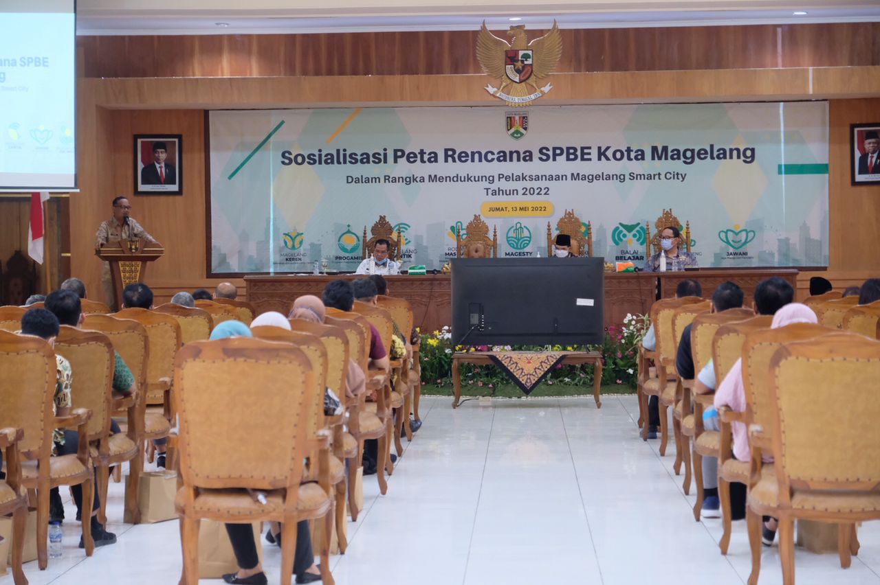 BNews—MAGELANG— Pemerintah Kota (Pemkot) Magelang melaksanakan sosialisasi peta rencana Sistem Pemerintah Berbasis Elektronik (SPBE) Kota Magelang dalam rangka mendukung pelaksanaan Smart City 2022. Acara digelar di Aula Adipura Kencana, kantor Wali Kota Magelang, Jumat (13/5/2022).