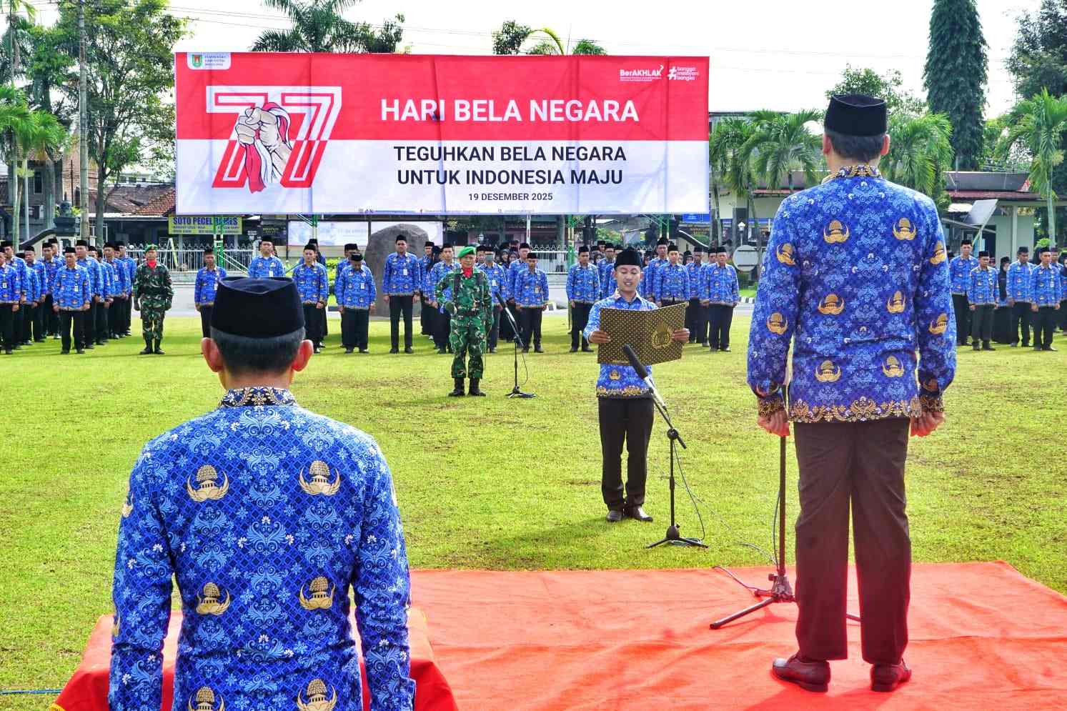 Upacara peringatan Hari Bela Negara ke-77 tingkat Kabupaten Magelang berlangsung khidmat dan diikuti oleh jajaran Forum Koordinasi Pimpinan Daerah (Forkopimda), ASN, TNI-Polri, serta berbagai elemen masyarakat. (bsn)