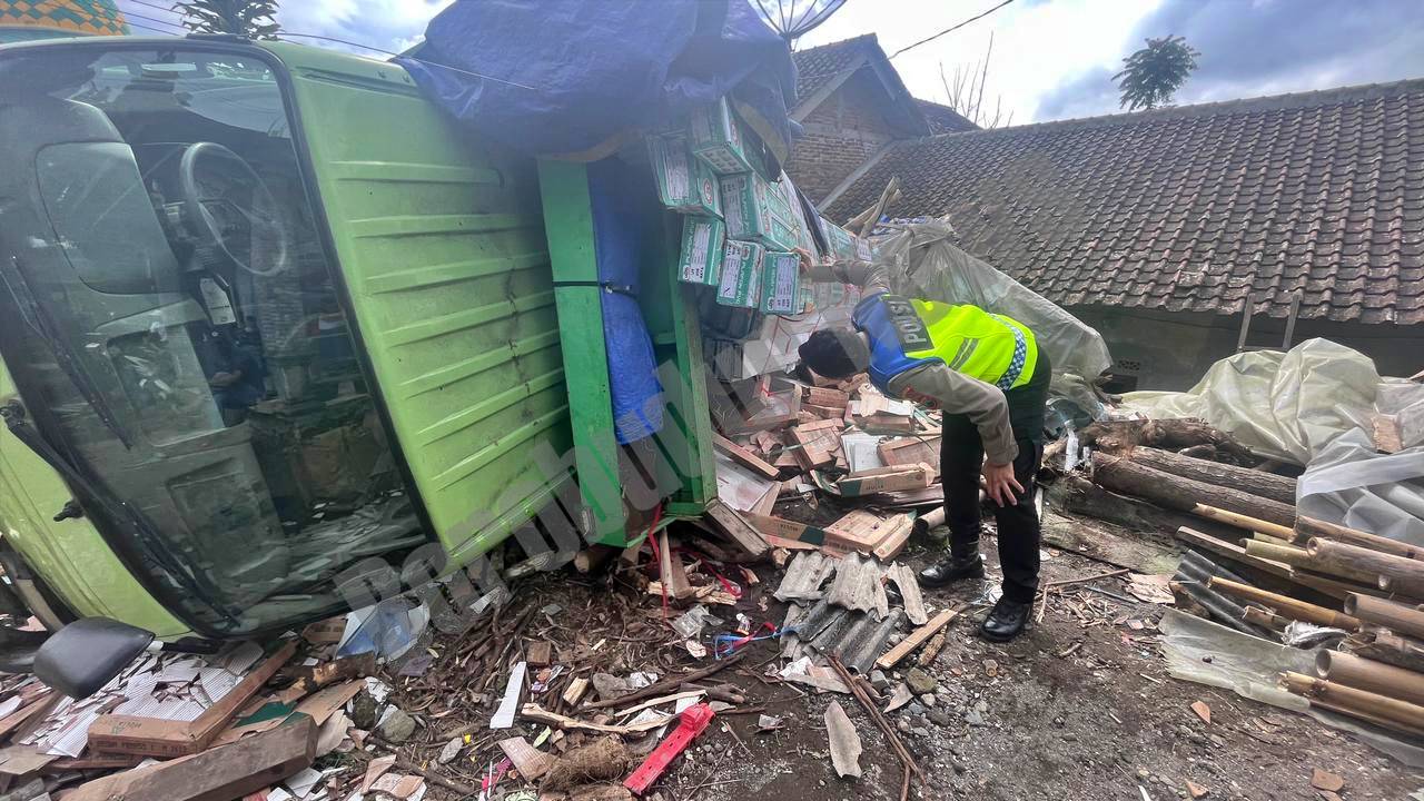 Dalam kondisi tidak terkendali, truk tersebut menabrak lampu penerangan jalan umum serta gubuk tanaman yang di dalamnya terdapat burung jenis kalibori.