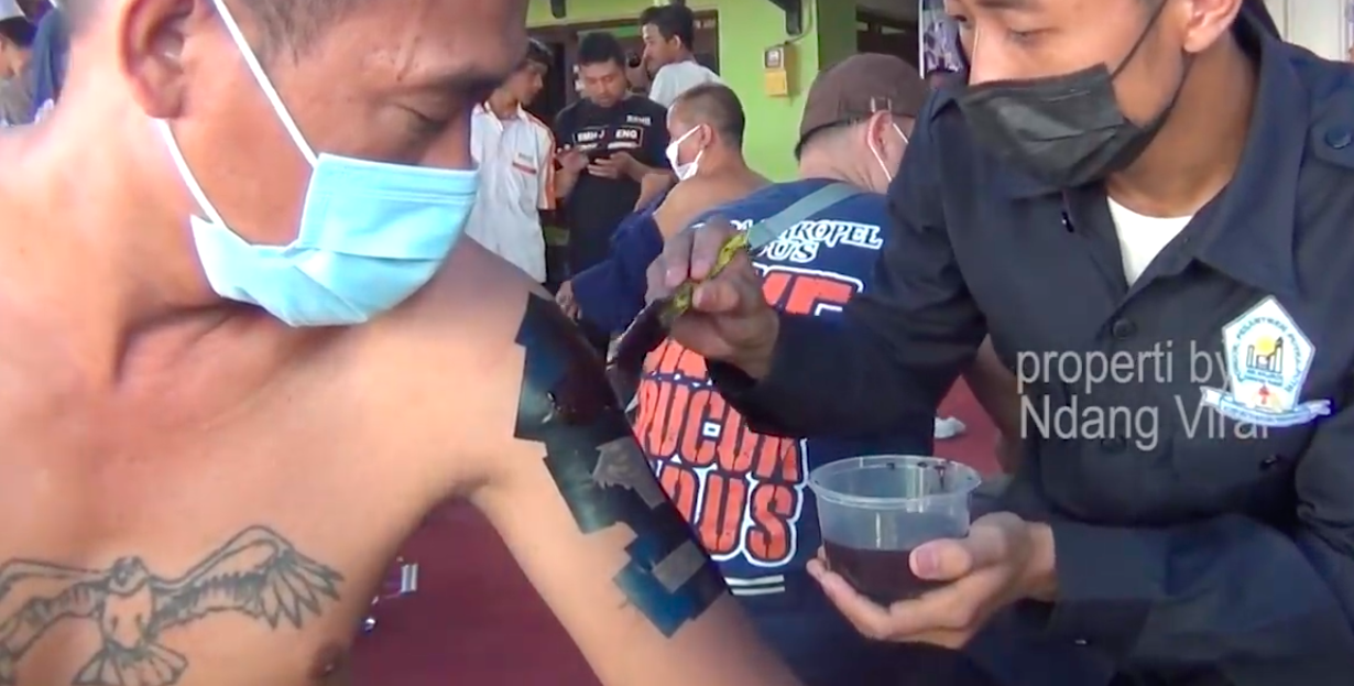 AJAIB: Santri An Najach Magelang mengoleskan ramuan ke kulit peserta hapus tato gratis. (sumber: youtube/ndang viral)