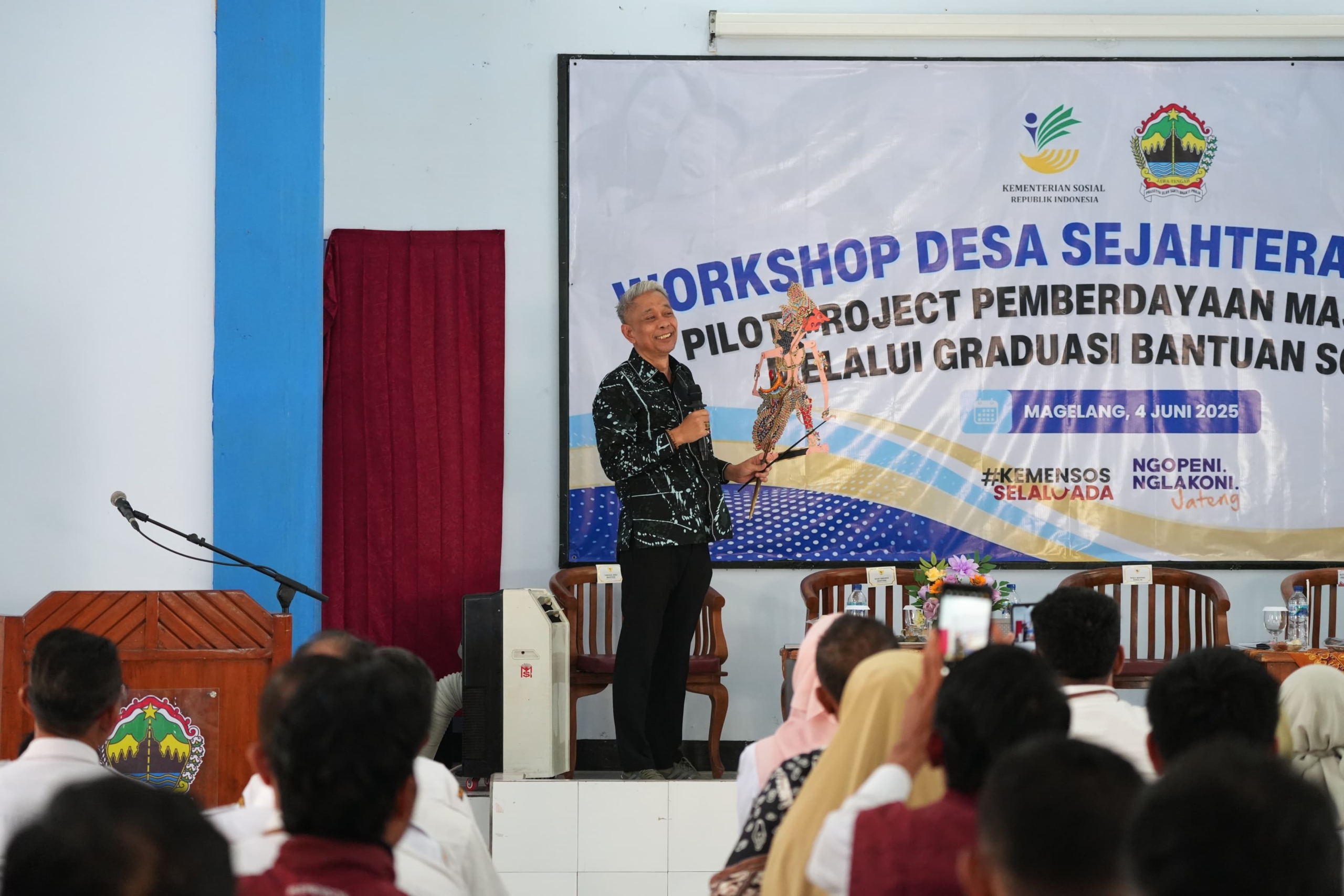 Wakil Menteri Sosial Agus Jabo Priyono menjadi narasumber Workshop Desa Sejahtera Mandiri di Gedung Serba Guna Tat Twam Asi Panti Pelayanan Sosial Anak Kumuda Putra Putri Magelang, Rabu (4/6/2025). Dalam paparannya, dia menjelaskan tentang strategi pengentasan kemiskinan melalui pemberdayaan. (foto: ist)
